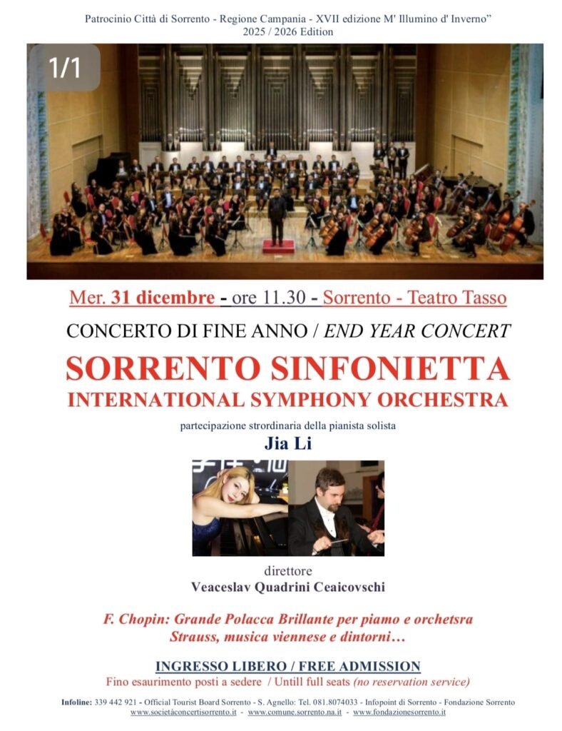 As piano soloist, collaborate with the Naples International Orchestra at the Sorrento New Year’s Concert on December 31.